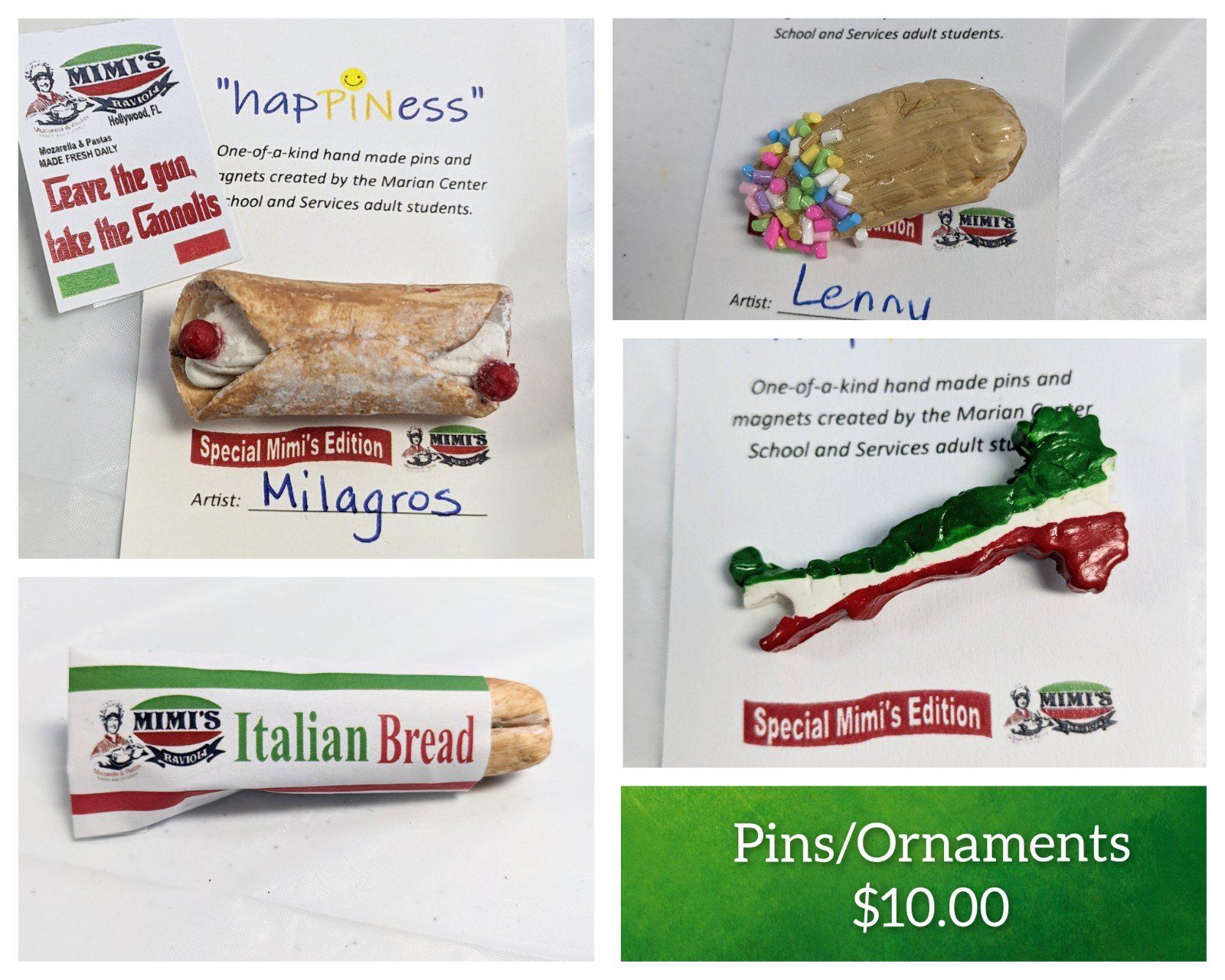 "Introducing our latest and greatest art adventure in the ADT! Our adult student artists have been busy refining their sculpting and creative skills in preparation for this art fundraiser! Linda, owner of Mimi’s Ravioli has graciously offered us a spot in their store to display our one-of-a-kind handmade pins, ornaments and magnets for sale! This series of Italian themed items is exclusively available for purchase at Mimi’s Ravioli store and restaurant located at 5714 Johnson St, Hollywood, FL 33021. Stop by Mimi’s and experience the authentic aromas and dishes of Italy, including their homemade fresh mozzarella stretched hourly, every day, all day! Open Tuesday through Saturday from 9 to 5, and Sundays from 9 to 2."